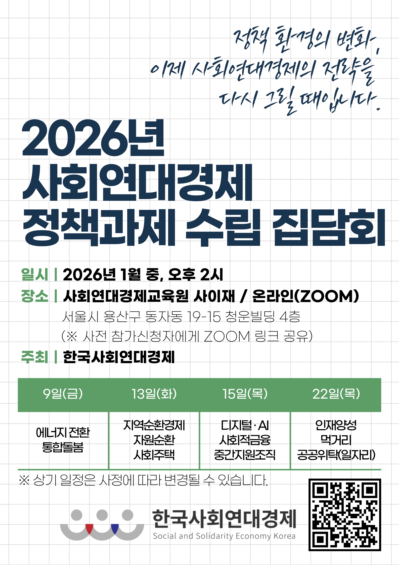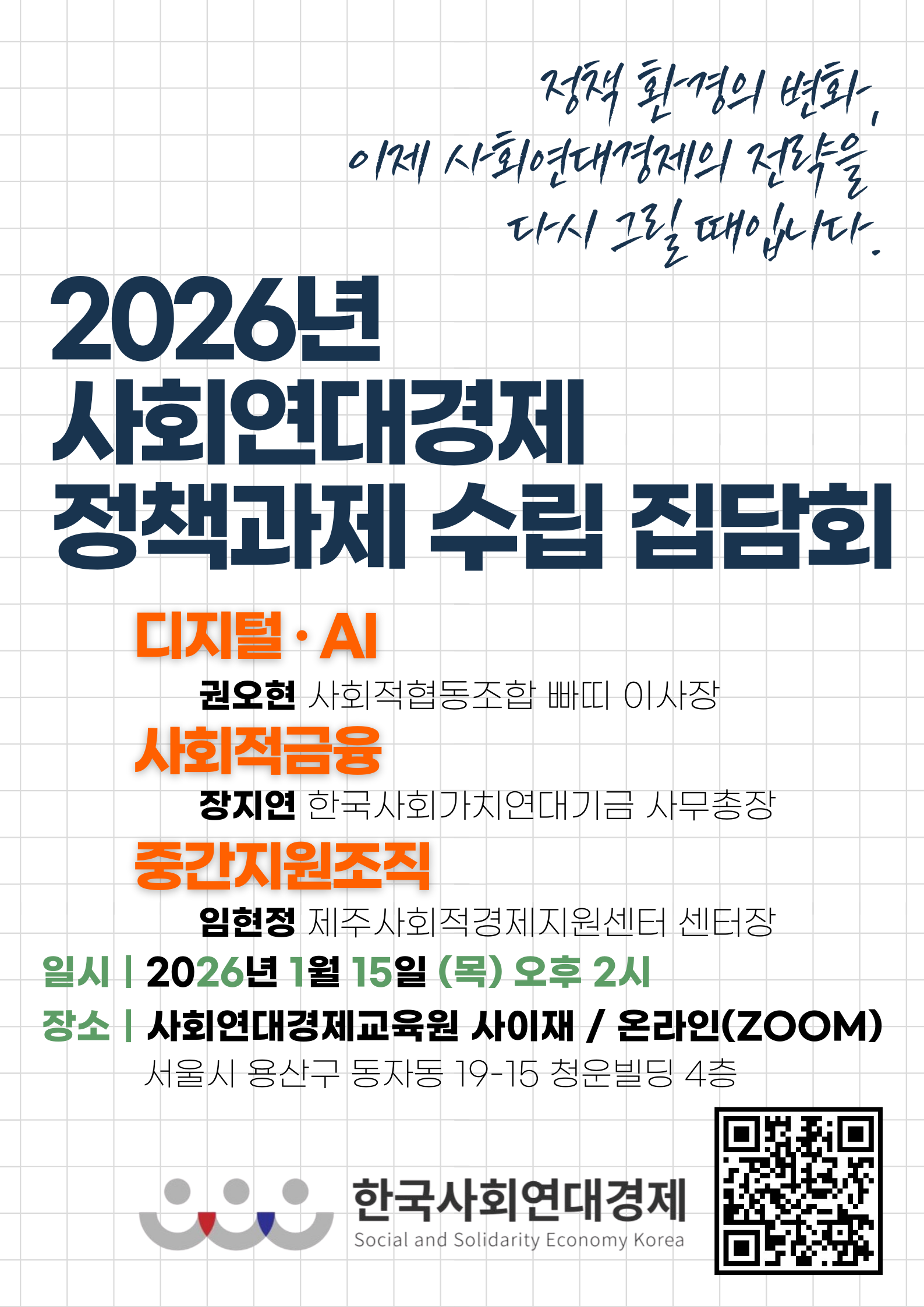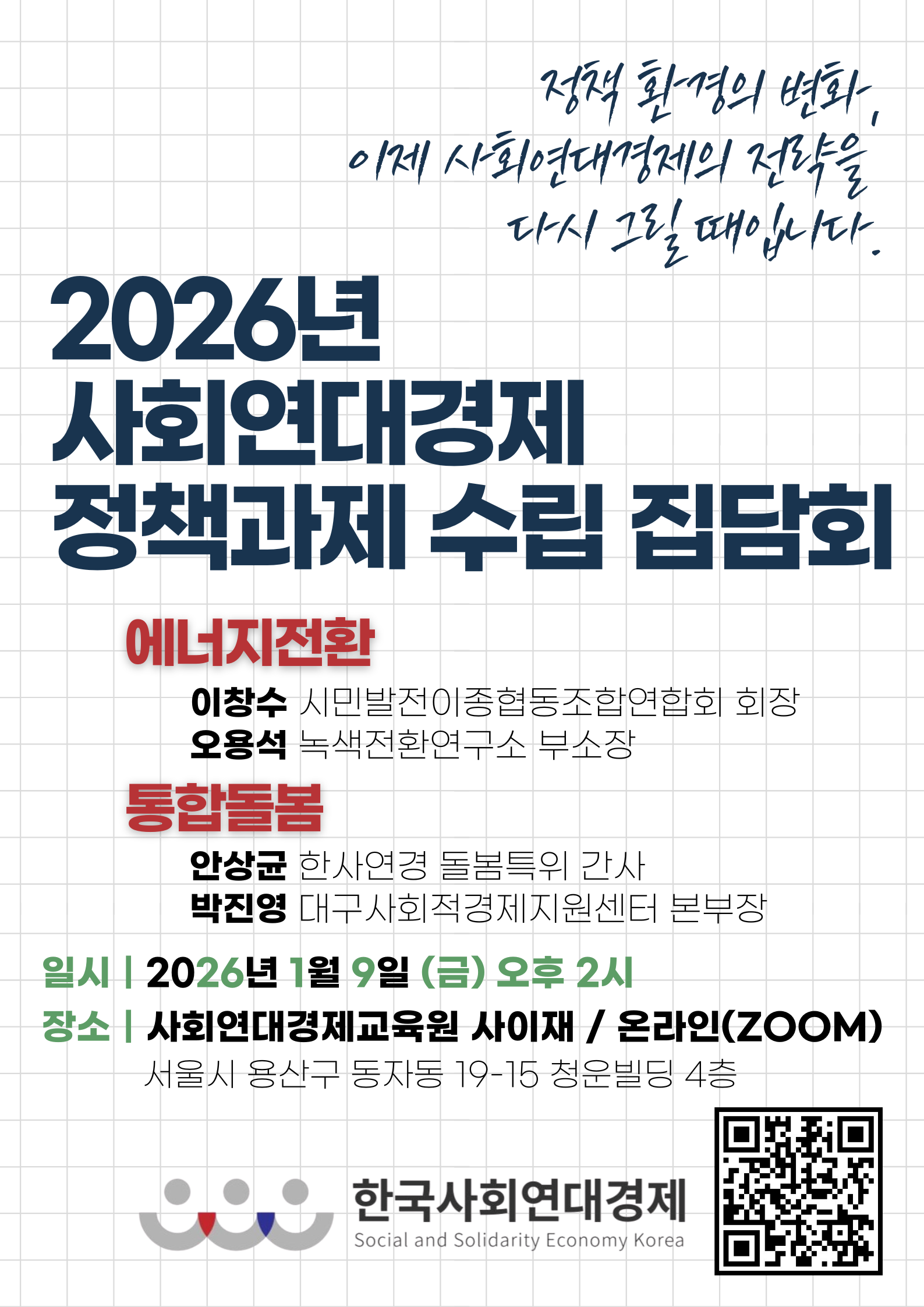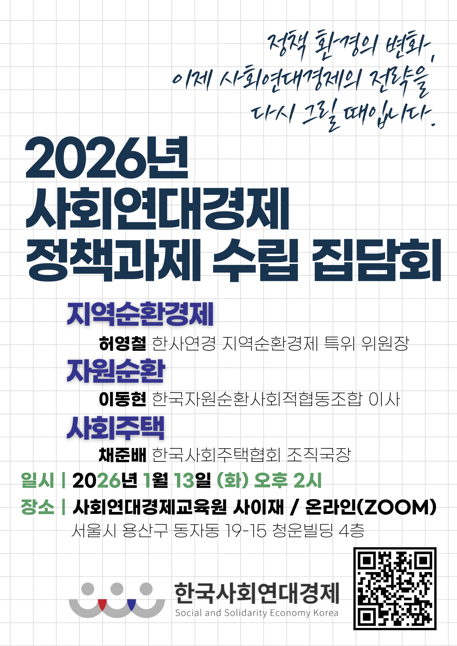 한국사회연대경제에서 진행하는 "2026년 사회연대경제 정책과제 수립 집담회" 안내 드립니다.