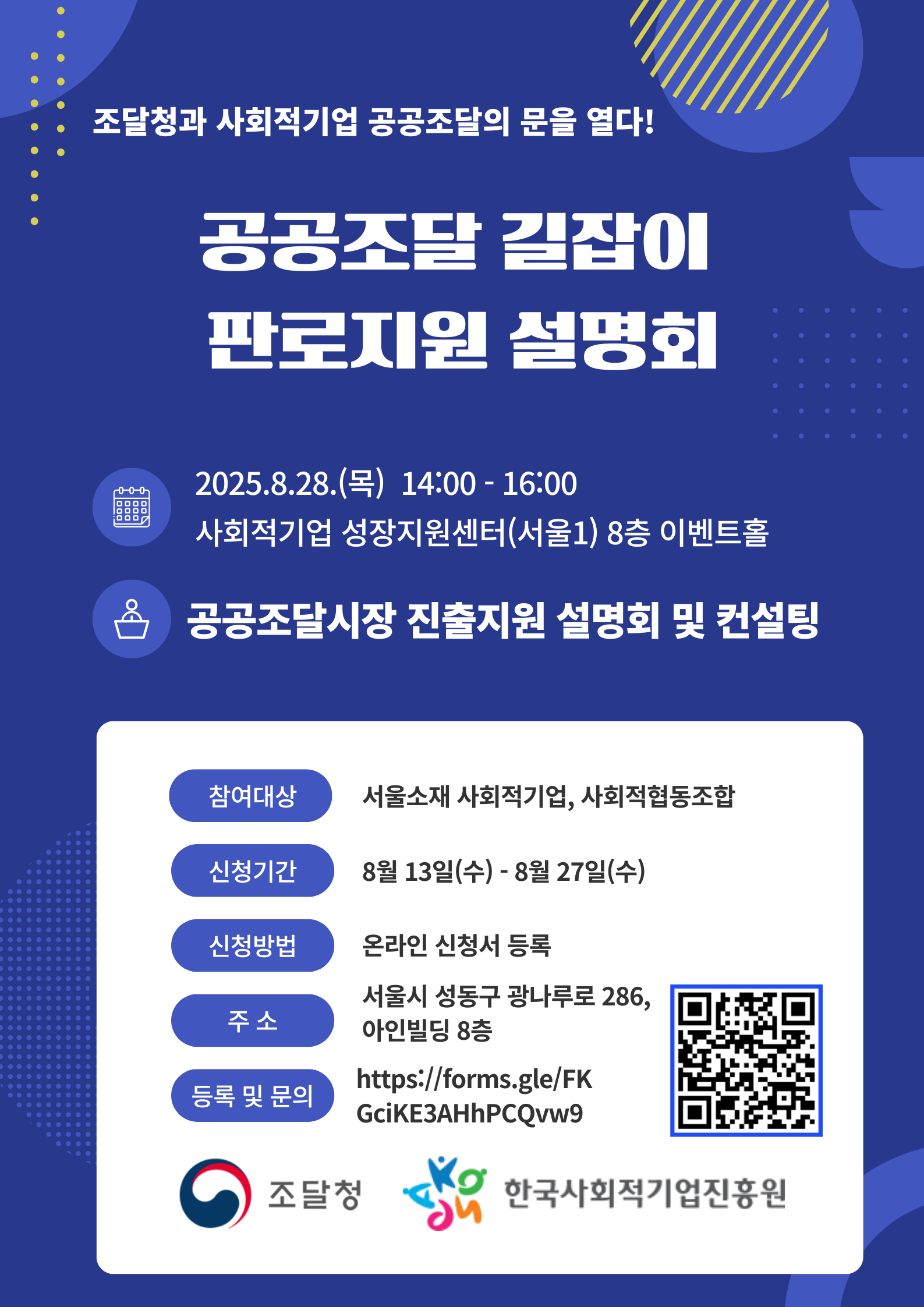 아래와 같이 『 공공조달 길잡이 판로지원 설명회 』 참여기업을 모집하고 있습니다.