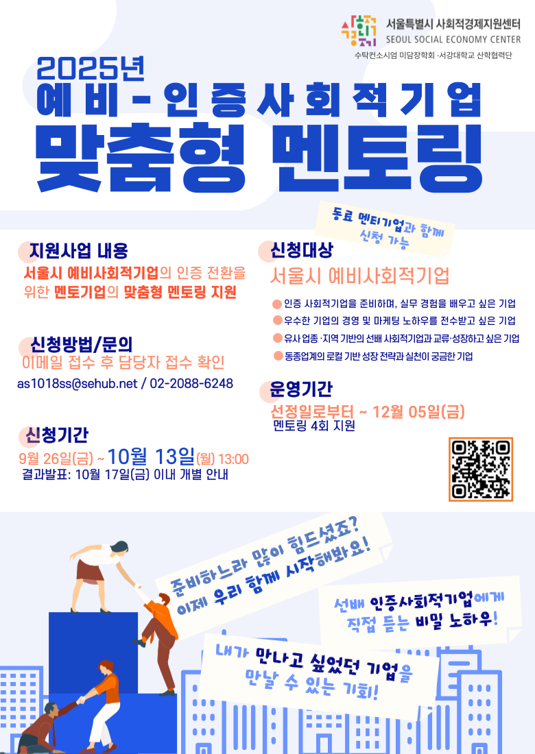 – 지원기간 : 2025년 10월 ~ 12월 05일(금) – 지원내용 : 멘토(인증 사회적기업)와 맞춤형 멘토링(각 4회, 회당 최대 3시간) ※ 기업부담금 없음